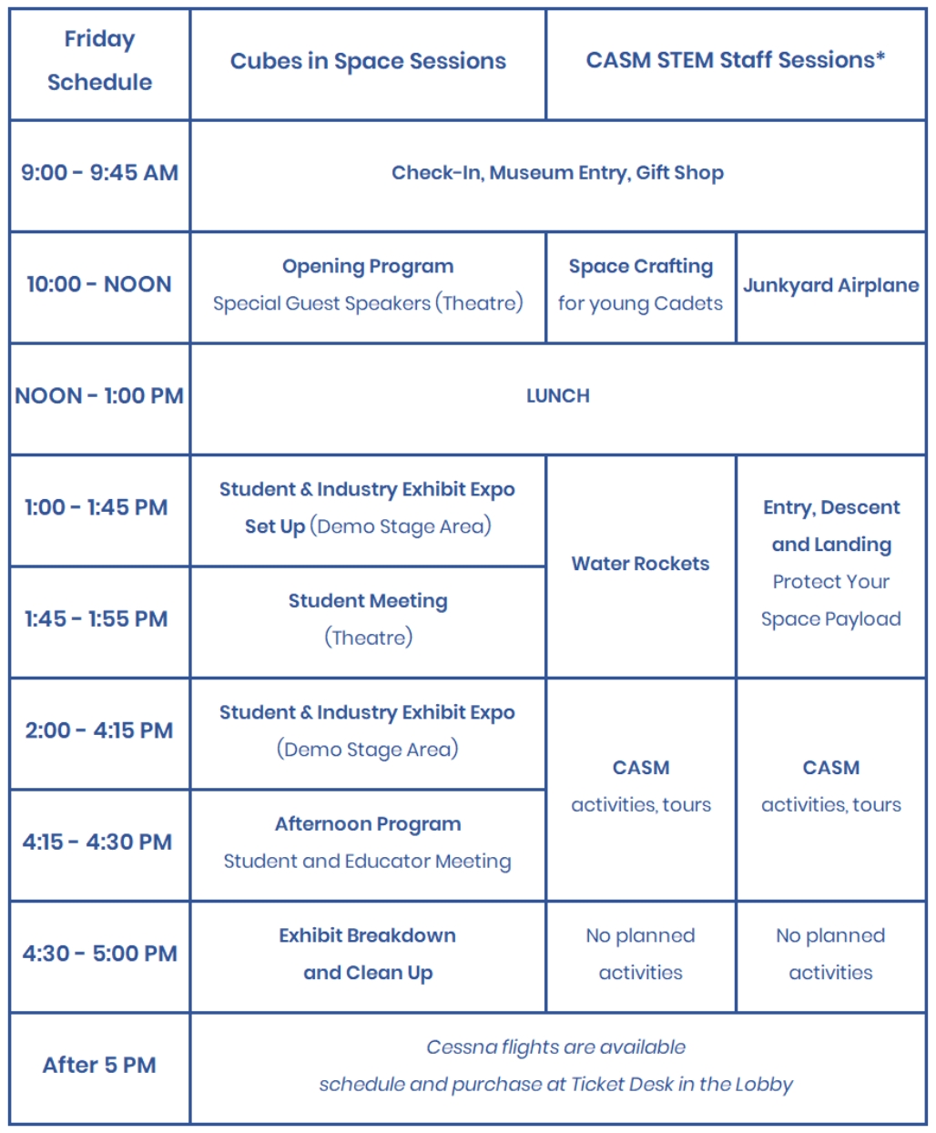 FlightFest programming officially begins Friday morning at 10:00AM at the Canada Aviation and Space Museum. Check-in times are limited by staffing availability.